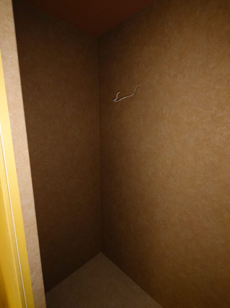 ふつうは角でピッと切って仕上げて、シール材を入れて仕上げるのが普通ですが、伊久良さんからのご提案で、「古民家だから壁が動いてコークだと切れちゃうから少し折り返して、コークで接着することで、もしコークが切れてズレても裏にクロスがいるから安心」という仕上げらしいです。